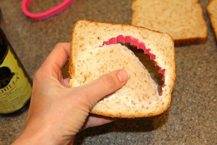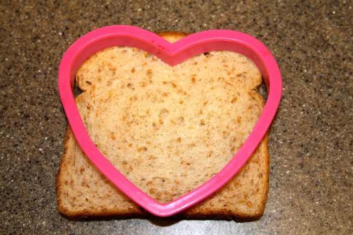 - Lay bread out on a flat surface, place heart cookie cutter on 1 slice, press.