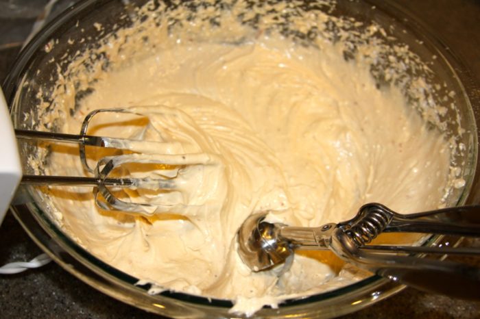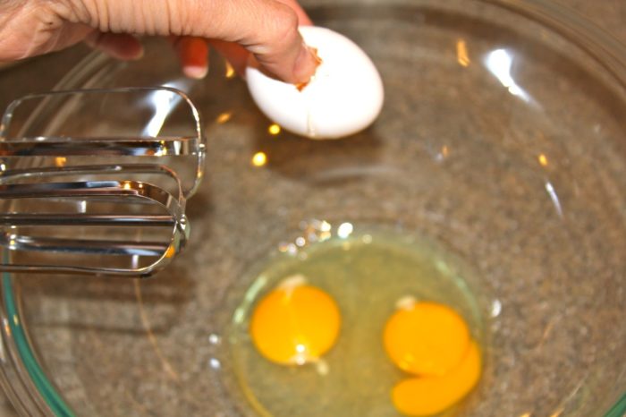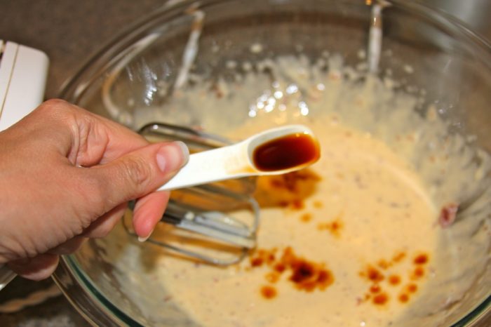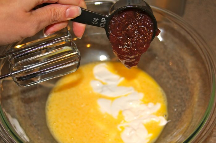 2. In a large mixing bowl beat eggs,add sour cream, jam, buttermilk, vanilla, and almond extract beat until smooth.