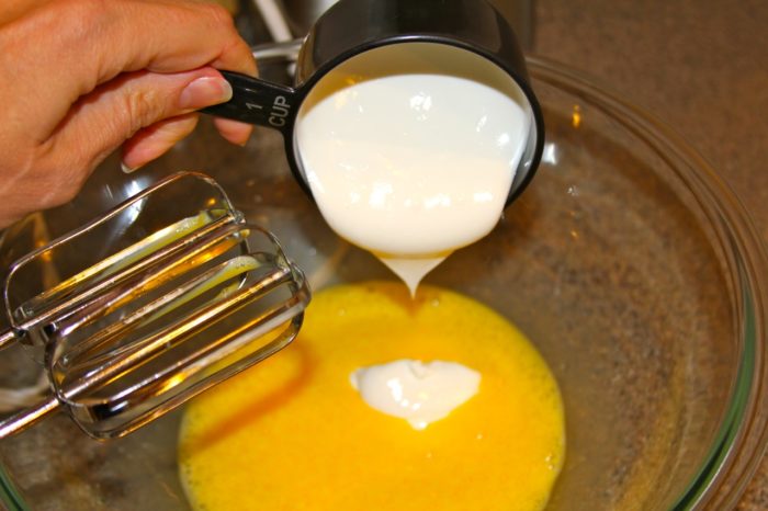 - In a large bowl beat eggs