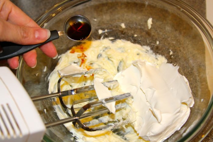 - Add cream cheese and vanilla, beat until smooth