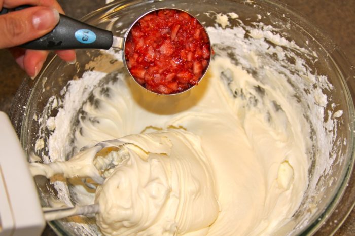 - Add diced strawberries, mix on low until evenly distributed