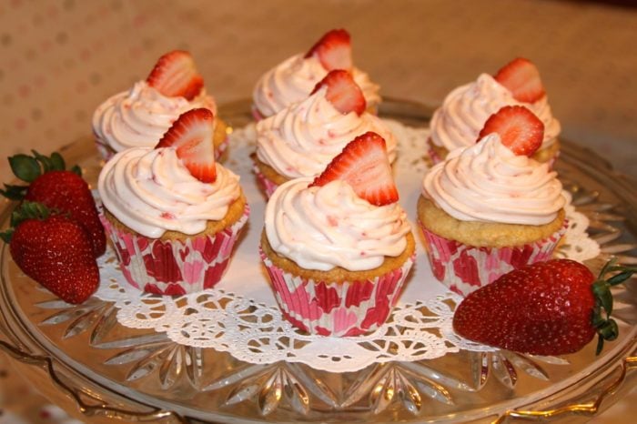 As I was searching around for a cute Valentine style cupcake to post…I happened across a couple different recipes and decided to combine and adapt them which successfully produced my “Strawberries and Cream Cupcakes”!!  They’re made from a cake mix so that’s an easy plus but they have such a Strawberry and Creamy taste that you can hardly eat just one!
