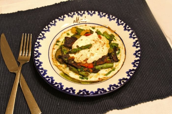 - Place omelet on plate, top with veggie mixture, and a slice of warm fresh mozzarella. Serve!