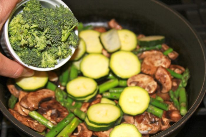 - Cut asparagus in 1 inch chunks, slice zucchini, break brocolli into small pieces, slice peppers