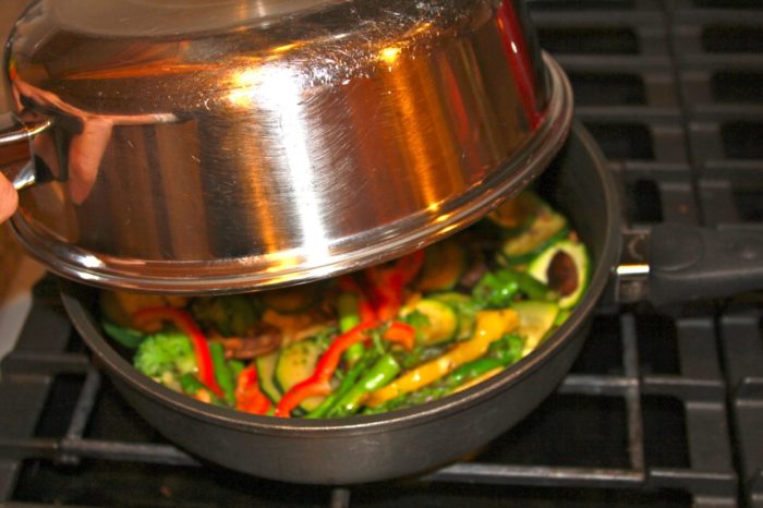 - Cover and cook 1 minute, stir, repeat until veggies soften slightly and brown a bit