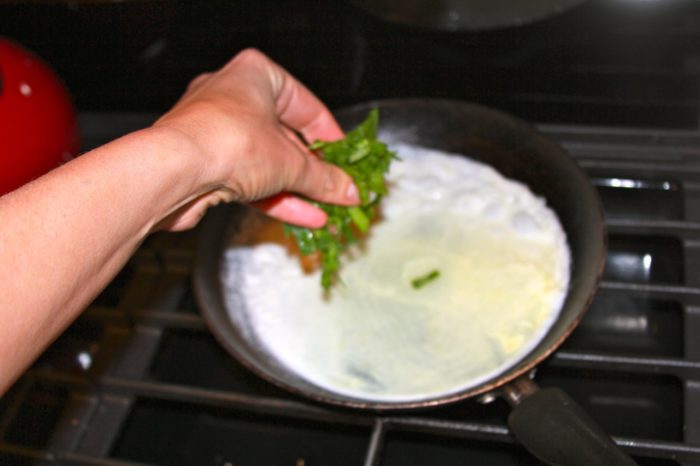 - In a small sprayed fry pan, add sliced spinach, cook 1 minute