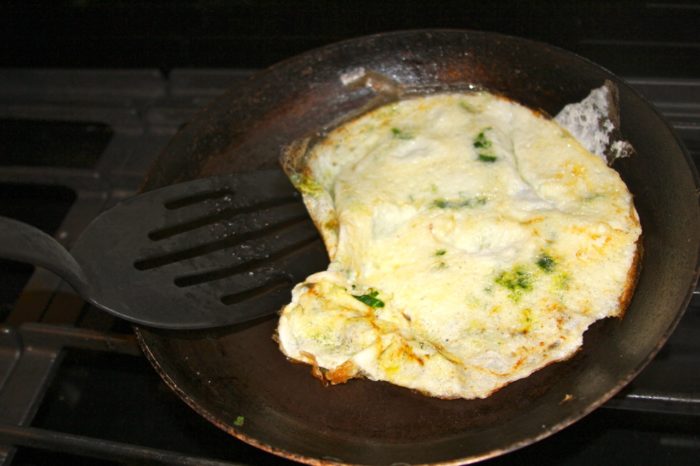 - Cook 1 minute, turn over when bottom is set and has turned white, cook 1 additional minute.