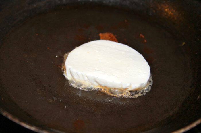 - Slice 1/8 inch slice of fresh motzarella, place in fry pan, cook 30-45 seconds per side to warm and slightly brown