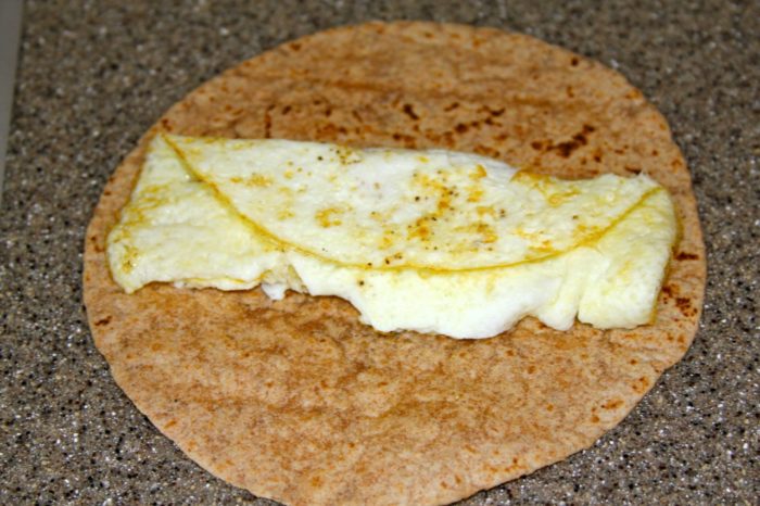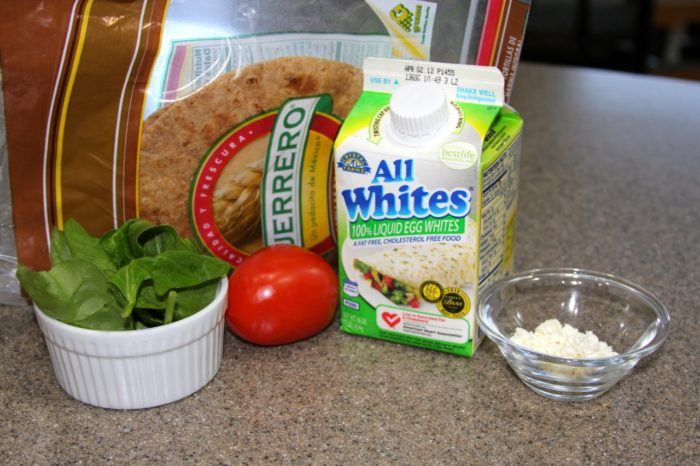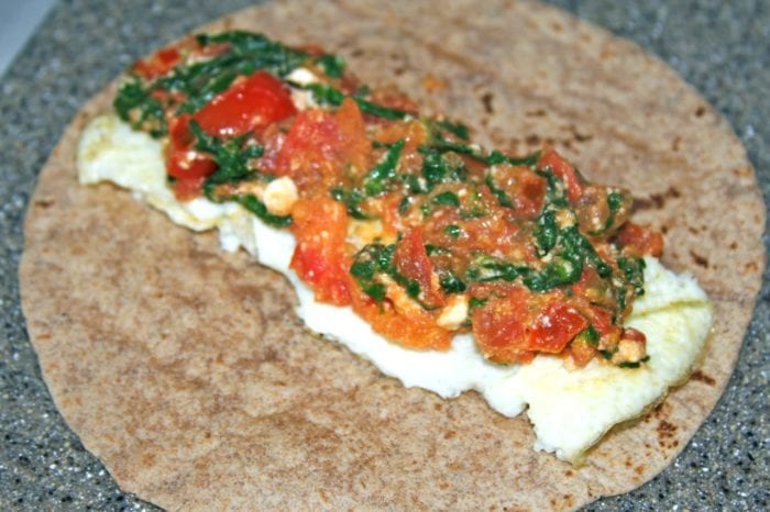 - Warm tortilla, fold egg white omelet in center of tortilla, top with tomato/spinach mixture. Fold in edges.