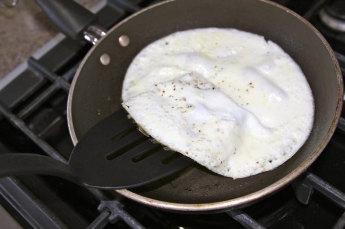- Coat fry pan with cooking spray–over medium heat, add egg whites, cook 1 minute, turn, cook 1 additional minute or until lightly browned.