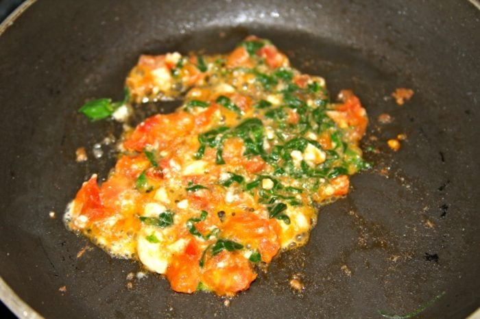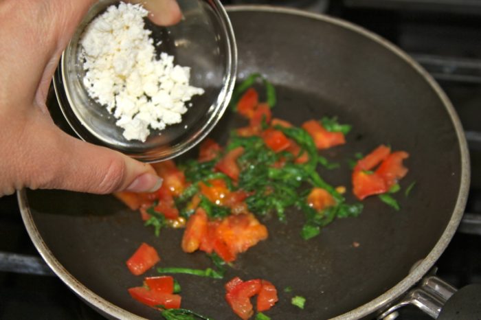- In same fry pann add tomatoes, spinach and cook 1 minute, stirring, add feta cheese