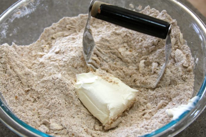 - Cut in cream cheese with a pastry cutter or a fork and knife until resembles fine crumbs