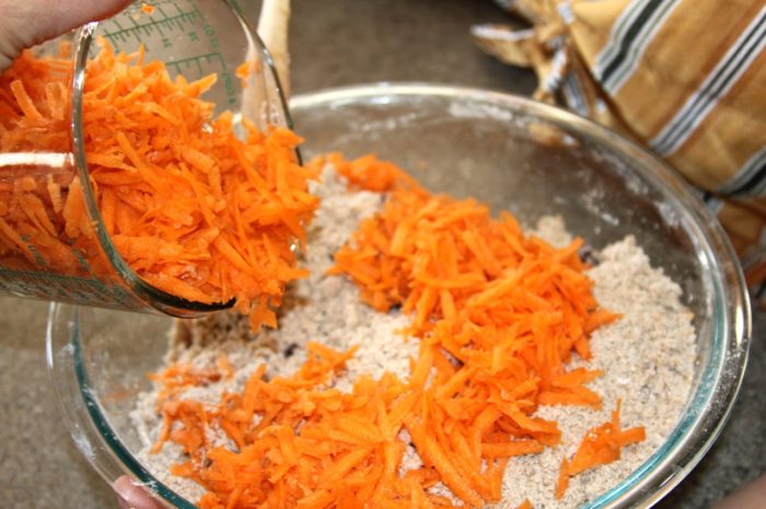 - Add carrots to dry mixture and stir in