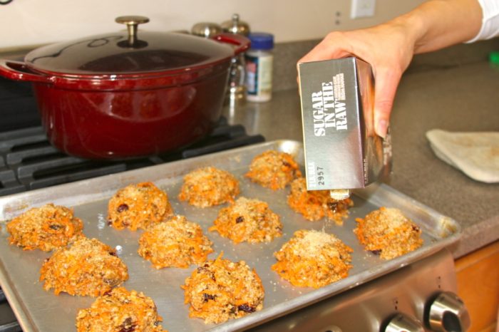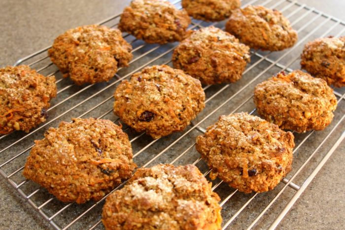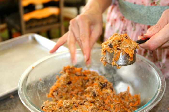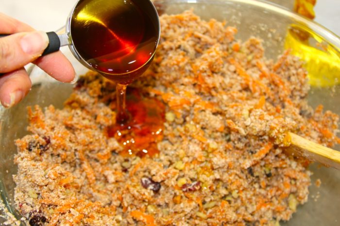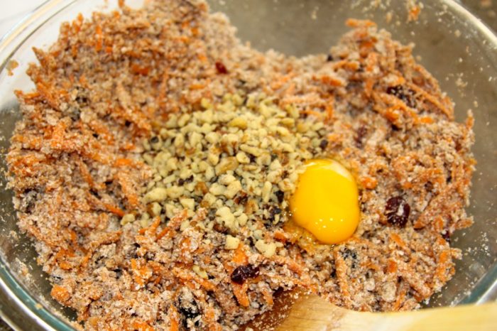 - Stir in the carrots, raisins, cranberries, walnuts, egg, oil, and agave until a soft dough forms.
