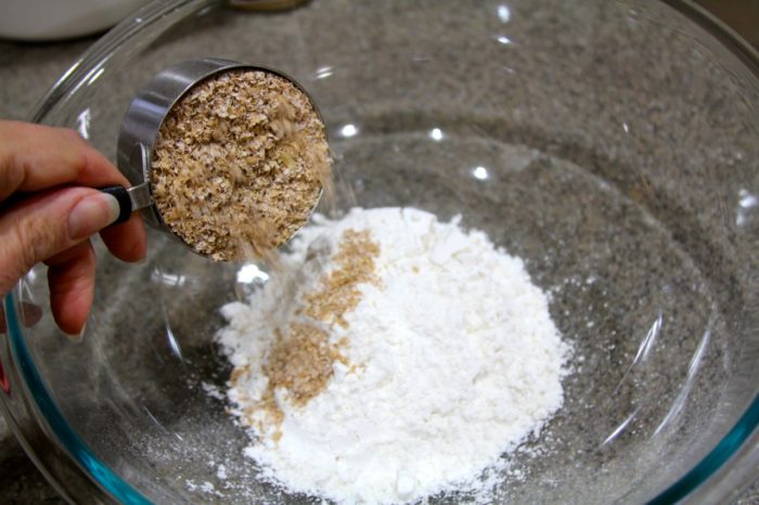 - In a large bowl combine white flour and bran