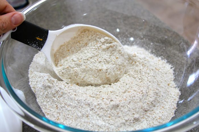 - In a large bowl combine whole wheat flour, sugar, salt, baking soda, baking powder.