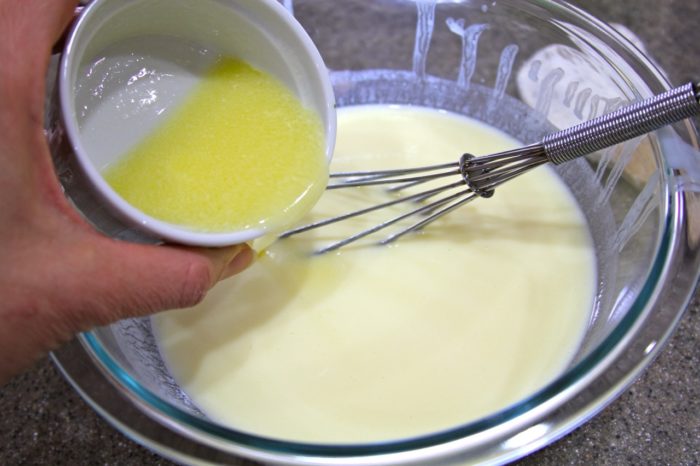 - In a smaller bowl beat together buttermilk and egg, slowly drizzle in 3 tablespoons melted butter while whisking.