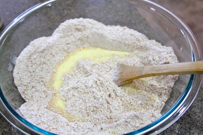 - Make a well in the dry mixture, pour the liquid mixture into well and mix until combined. Will appear more as a stiff batter than a soft dough.