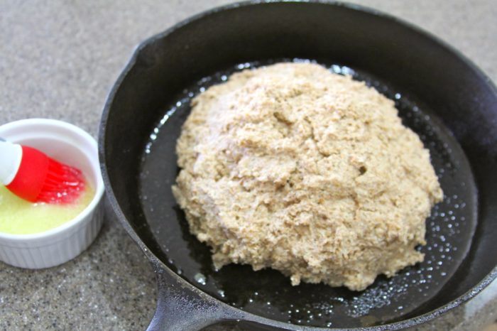 - Scoop the dough out of bowl and into baking dish, mounding in the center.