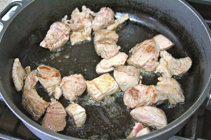 - In a large skillet add 1 Tbsp oil, when it’s hot, add small batches of meat