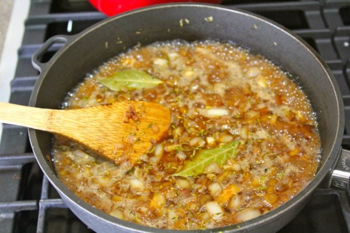 - Add chopped onion to skillet and 1/4 C water, stir scrapping the bits off the bottom of pan