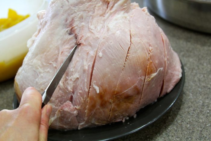9. Score ham with a sharp knife in a pattern of 1 1/4 inch diamonds.