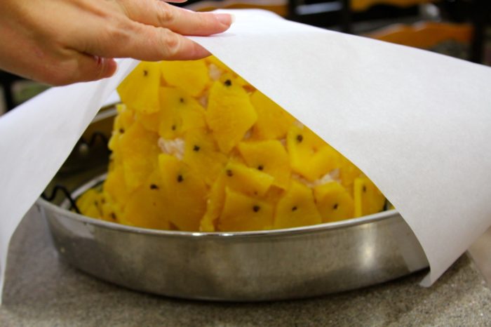 13. Cover ham with parchment paper and then foil, bake for 1 hour.