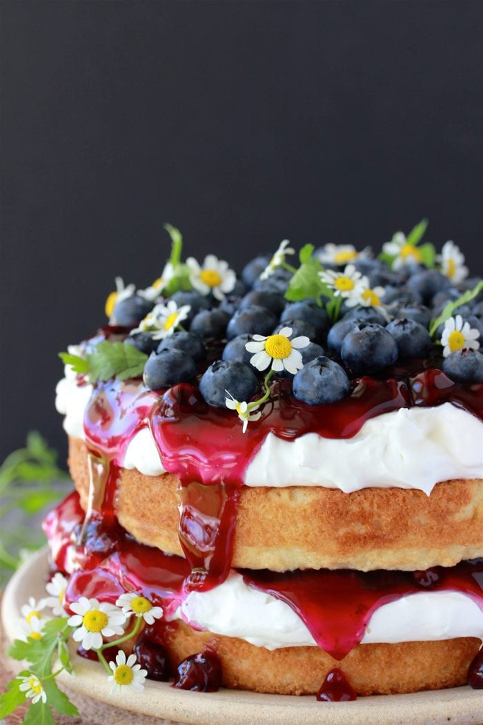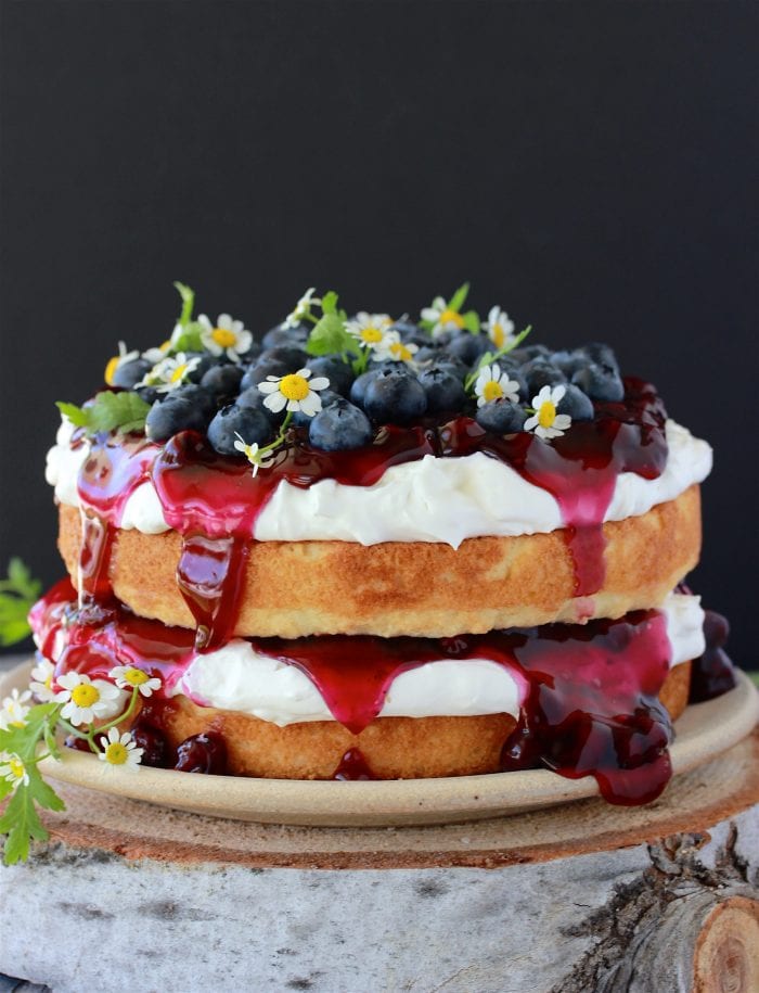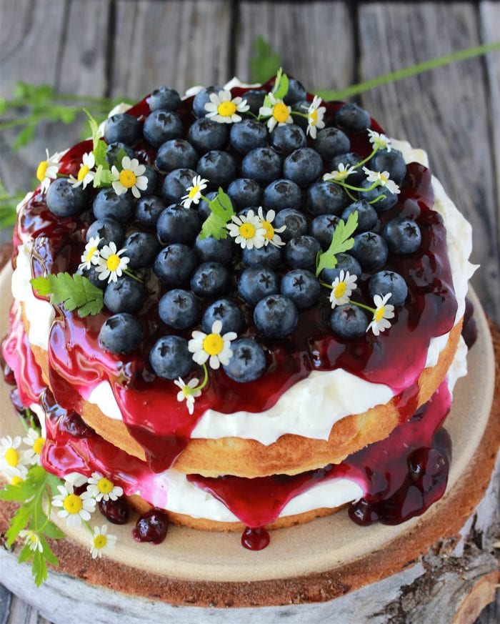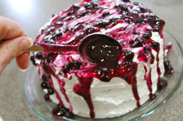 - Drizzle remaining blueberries on top an ddown sides of the cake