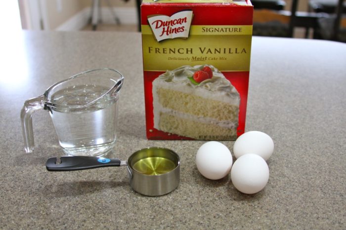 - In a large mixing bowl combine cake mix, eggs, water, and oil (prepared to package directions)