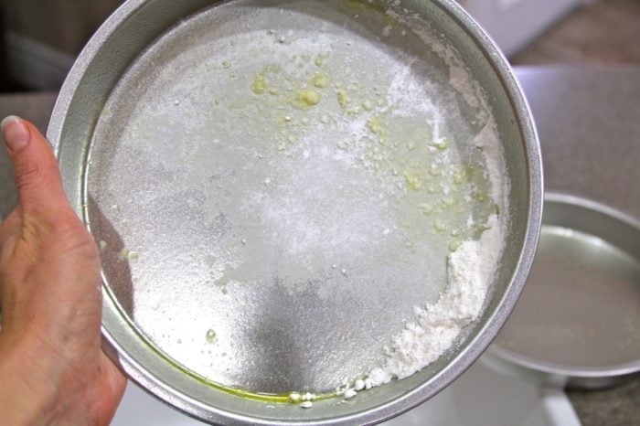 - Spray 2 9inch round pans with cooking spray and then coat with flour