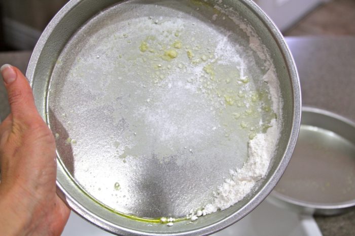 - Coat 2 -9inch round cake pans with cooking spray and dust with flour.