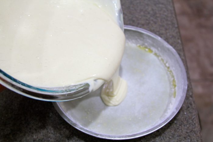 - Pour half batter in each pan