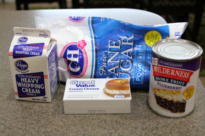 - seperate layers, 1/2 C whip cream mixture and 2-3 Tbsp blueberry pie filing to each layer