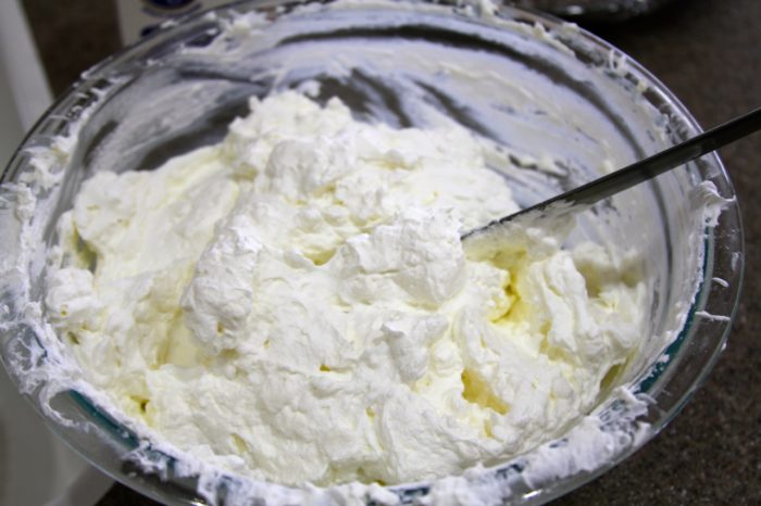 - In a small mixing bowl, beat cream cheese so it softens and add into whip cream