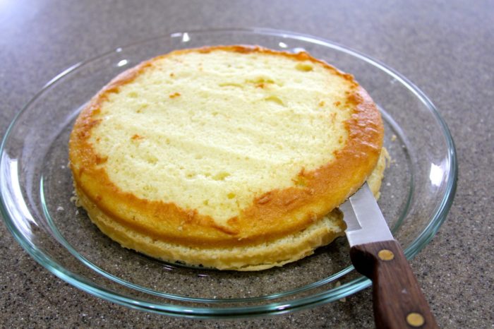 - slice each cake in half and remove the top part of the hump off one cake so it will stack easily