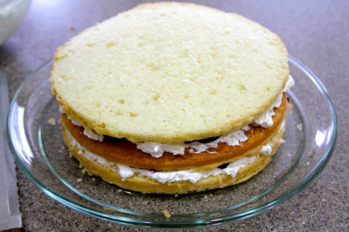 - Cut the second cake in half so that you have 4 layers.