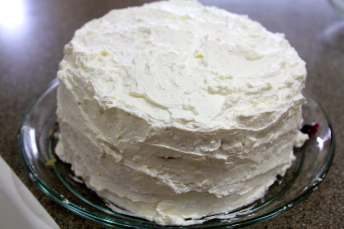 - Spread 1/3 C of cream cheese frosting, add then 3 Tbsp blueberry pie filing, swirl lightly with knife to combine and repeat with remaining layers.