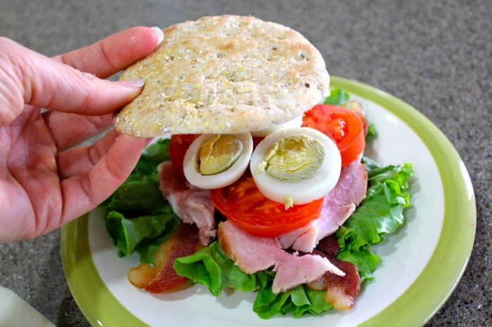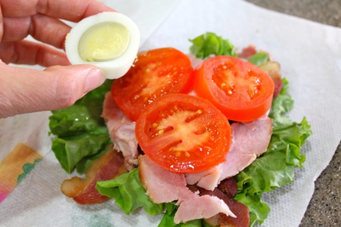 - Layer with lettuce, tomato, bacon, ham, and egg; replace top.