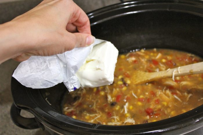 - Add cream cheese 20 minutes before serving, remove chicken, shred with 2 forks, return to pot, stir well.