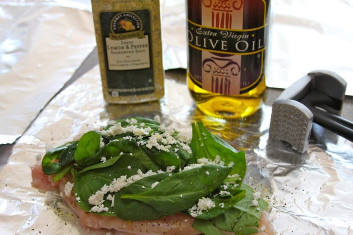 4. lace 1/2 C spinach leaves on each breast, sprinkle with 1 Tbsp feta, drizzle with 1/2 tsp olive oil.