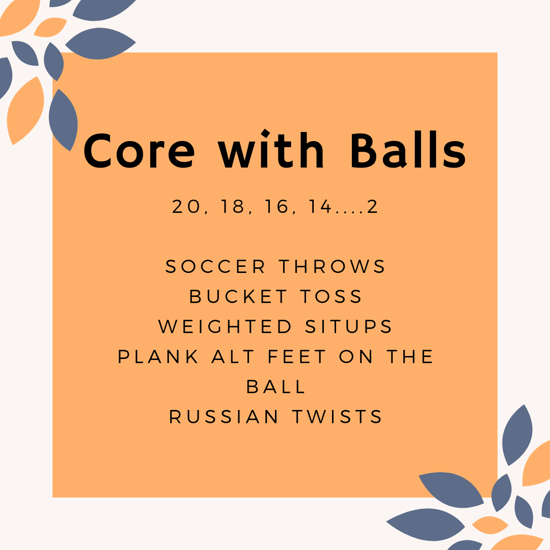 Today we are doing core work with weighted balls. I prefer the heavy balls that are covered in cloth, not the weighted balls that bounce, for this workout. Pick whatever weight challenges you but that is also doable, I like to use 14 lb balls.