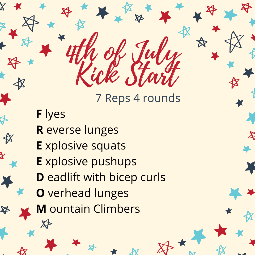 I am still doing workouts on my own or with a friend most days. I haven’t hit up CrossFit yet because I can’t take kids, which limits me way too much. With that in mind I have been thinking ahead to decide what fun workout I want to do to celebrate the 4th of July.