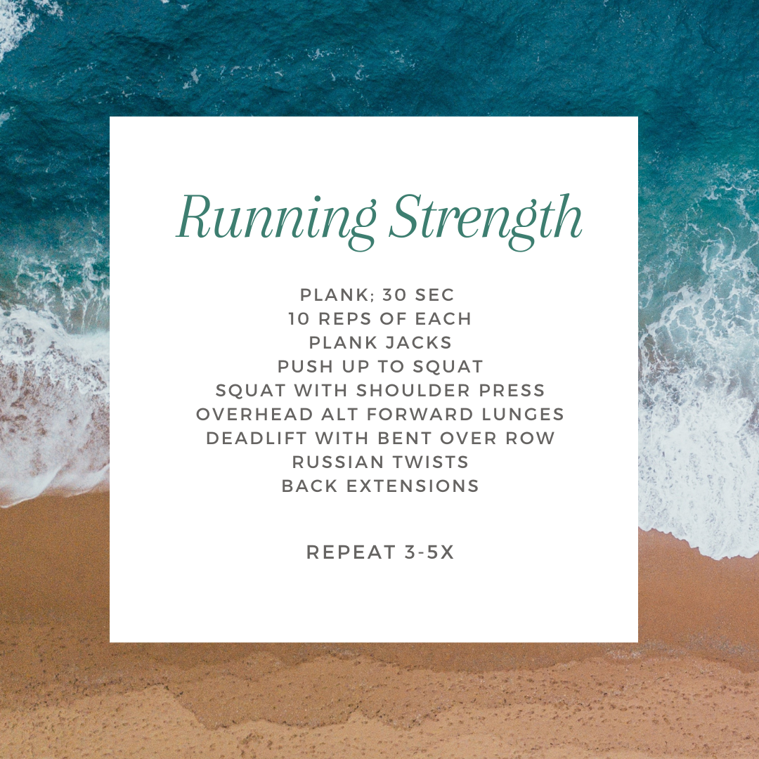 With those two things in mind we are going to focus this week on a strength training workout great for runners. Runners need more than just mileage on their legs, a strong core and upper body will allow for a stronger power house. Working on lower body will allow for runners to dig for some extra power while also preventing muscular imbalances and injuries. Full body movements are ideal, as living breathing animals our body works together, not in segments.
