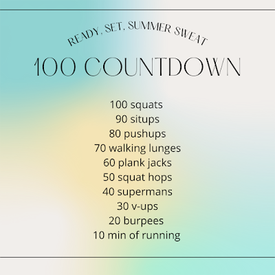 This week we are doing a 100s workout, not to be more or make it to that next level of er, fittER, strongER, etc. Instead we are doing a 100s countdown workout to remind ourselves of what we can do what we have already accomplish.