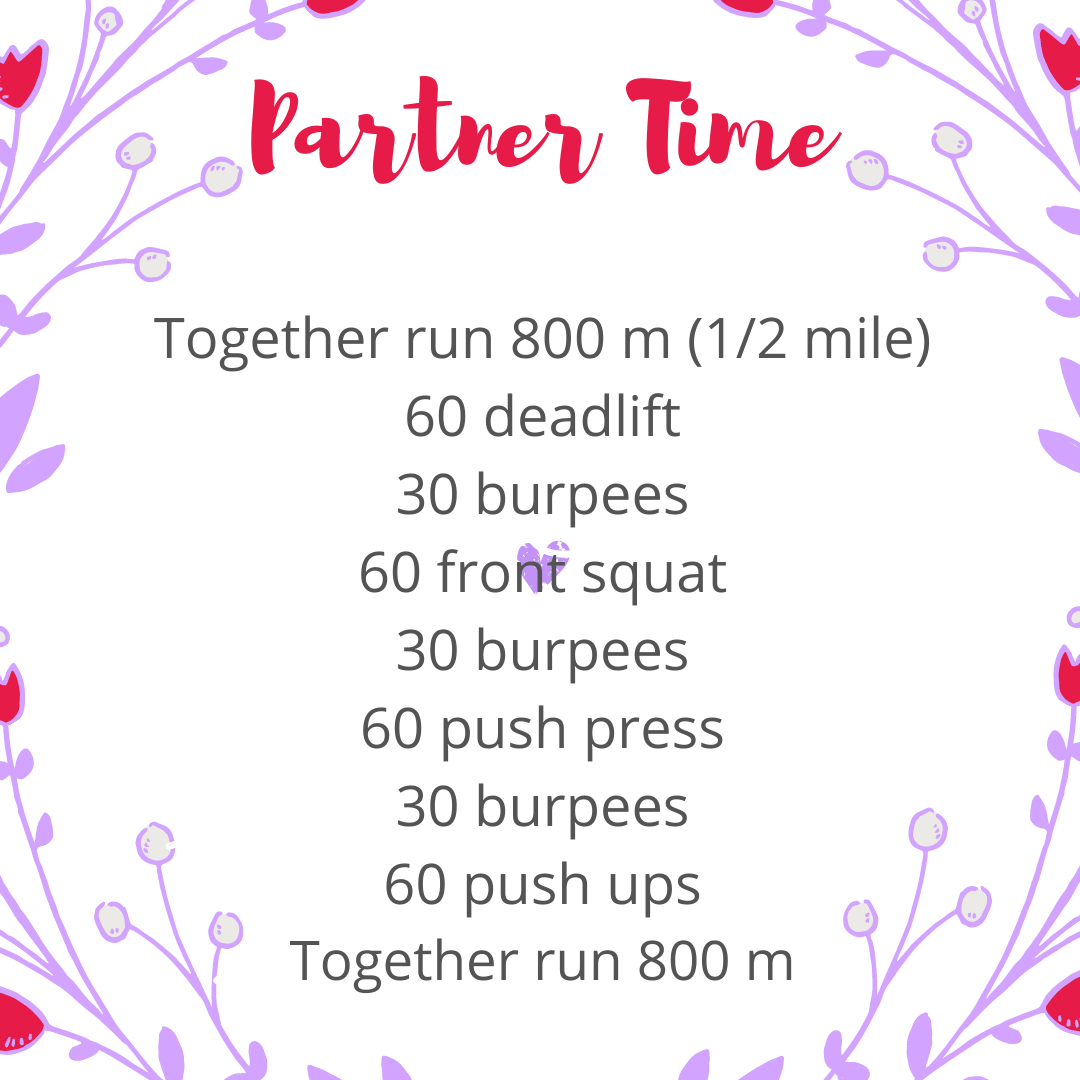 This week we are doing a partner workout. A chance to grab a friend and hit the gym, or wherever your workout, together. Save the chatter for warm up and cool down. Work hard on the push and cheer each other on.